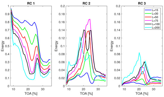 The influence of window length L on the mean energy for the first three RCs is presented in Figure 7. Only first RCs are shown, as it is expected that instabilities will be expressed in the components with high variance. The window length L varied from 15 to 200 data points and computations were performed for signal length N = 10,000. Depending on the window length, the traces of inlet recirculation are clearly present in RCs 2 and 3. Some effects of recirculation appear even in RC 1 for the almost all values of L. RC 2 isolates well the inlet recirculation for L = 30, 50 and 75. For higher values of L, a more consistent indication of recirculation can be obtained from higher components, as the behaviour of energy is more consistent throughout the TOA range. The drop in of RC 2 for L = 100 is not expected, as the recirculation intensity was high in that region [9]. This implies that some of the energy from the phenomenon was passed to a different RC.