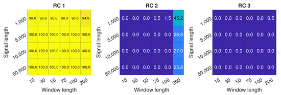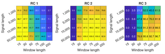 Figure 9 presents the detection potential for all of the combination of parameters. It can be shown that RC 2 performs well in a range of windows from 50 to 100. RC 1 can be used as a measure of inlet recirculation for the shortest window lengths, but it provides no differentiation between inlet recirculation and surge, which can be deducted from Figure 7. For the longest windows, the response of RC 3 to appearance of IR is also visible, but it is comparable to RC 2 only for L = 75. For most parameters, shortest signal length does not provide a satisfactory level of detection, reaching close to 80% for most of the window lengths. For N = 5000, over 95% accuracy can be reached, and for N = 10,000, almost 100%. Similarly as for EMD, the longer the signal, the higher the accuracy of detection.
