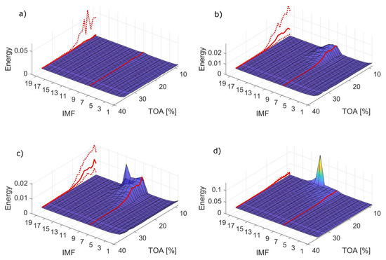 Surface plot of energy in the studied range for varying signal lengths: (a) N = 1000, (b) N = 5000, (c) N = 10,000, (d) N = 50,000; solid line represents the mean energy of IMF 9, marked with red line on the surface plot and dashed lines represent energy confidence intervals.