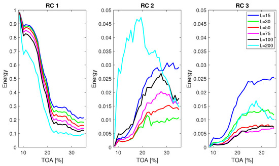 For RC 2, the relation for changing window length is not that structured. For the two shortest window lengths, their value almost monotonically decreases with decreasing TOA—the majority of energy is transferred to RC 1 as the instabilities appear in the flow. For L from 50 to 100, the energy level is stable for the most part and decreases for the region of surge instability. For the longest window L = 200, the increase in energy of RC 2 is present for the mild surge region and a drop takes place when deep surge occurs. Only for this window length, the separation of components is sufficient to distinguish mild from deep surge. The overall shape of the mean energy is not as smooth as in case of EMD. It might be attributed to variations in the frequency content of RCs and transfer of energy in between the components.