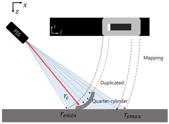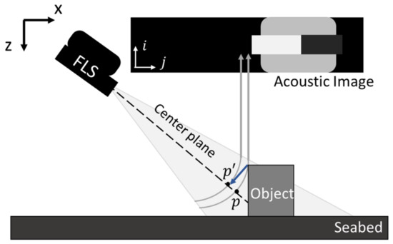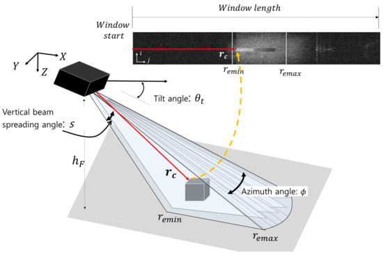 The ROI is defined by calculating . Let the sonar return data be and let the i-th row of be , where and . Given the altitude, , of the FLS, and the corresponding pixel index in the image space are obtained as follows: