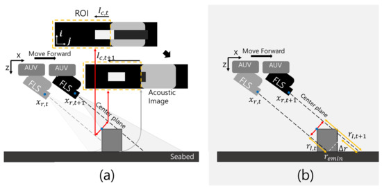 When an AUV equipped with an FLS moves forward, variations in the highlights in the image can be described, as shown in Figure 5. If the AUV maintains its altitude and the tilt angle of FLS remains constant, the position changes of the FLS are coincident with the location changes of the AUV. The position changes are denoted by to , and the highlight length in the image plane increases from to (Figure 5a), which is based on the sonar image generation mechanism of FLS. Based on the sonar projection geometry, is approximated as (Figure 5b), where is the function for transformation into pixel space. The following relation is derived: