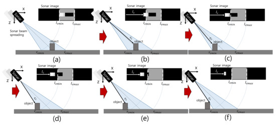 Stepwise changes in the sonar image when the sonar approaches an object from (a–f).