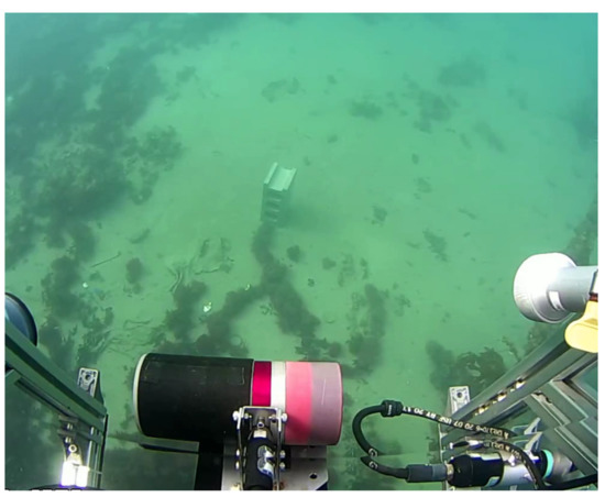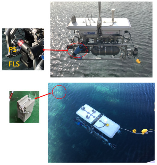 The FLS and PS on the AUV were installed according to the specialized configuration shown in Figure 11. The PS was configured to have a maximum range of 10 m, a gain of 25 dB, a scanning sector of 60, and a rotating speed of 1.2/s. The FLS was set to have a window start of 0.83 m and a scan range of 5 m, and both sonars were tilted by 25. The other acoustic specifications of the sonars were the same as those presented in the simulation section. The deployed object was a concrete brick with the size of 0.19 m × 0.39 m × 0.15 m (W × H × D). The brick was deployed on the seabed, as shown in Figure 12. The AUV with two sonar devices scanned along linear trajectories over the object at a constant altitude of 1.8 m. Sonar and AUV data were associated at a frequency of 10 Hz.