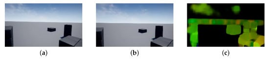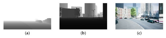In addition, AirSim can acquire mesh information from Unreal Engine 4. The available information includes location, temperature, and images. The obtained images include RGB, segmentation, infrared, and depth images. The depth image in AirSim can exactly measure up to 200 m. Therefore, the AirSim environment enables to obtain and label both RGB and accurate depth images at the same time to create training dataset. Figure 1a shows a depth image up to 10 m taken by a real depth camera that can be installed on real small drones in the AirSim environment. Figure 1b shows a depth image up to 200 m obtained from a depth camera in AirSim. Figure 1c shows monocular image taken by monocular camera in AirSim. As shown in Figure 1, in monocular image and depth image up to 200 m, can detect objects, however depth image up to 10 m cannot detect that. Therefore, the more distance can be measured, the larger the benefit of using depth images for autonomous flight. However, to obtain a 200 m deep image with a real drone, it is necessary to install a camera of great depth, which is unrealistic. Therefore we propose a method for estimating the depth image obtained by AirSim based on a monocular image.