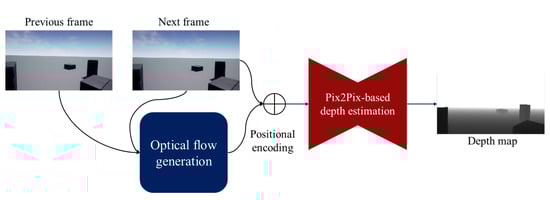 This section describes a proposed depth estimation method, which is based on Pix2Pix []. Figure 2 shows the system overview of our proposed method. Here, we briefly address our proposed method. The proposed method consists of three parts: The first part generates an optical flow map from two adjacent frames. Second, we combine the generated optical flow map with a monocular image. Finally, the combined image is input into a Pix2Pix-based depth estimator to create a depth image. In the following, we detail each part of the proposed method.