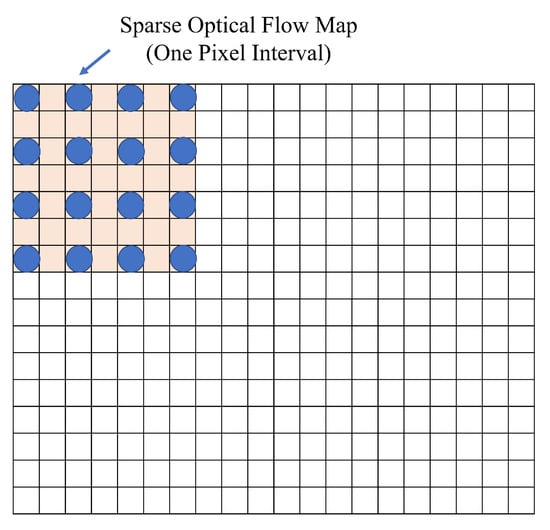 Here, represents the horizontal and vertical difference values of the image at point x. represents the time difference value between adjacent frames at point x. Lucas-Kanade method [] is used to find the displacement v at each position x that minimizes the sum of the squared luminance differences. By differentiating Equation (2) by and setting it to 0, the optimal travel distance is obtained as follows:
