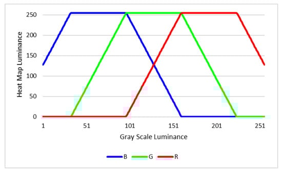 The luminance of red, green, and blue towards gray scale luminance is corresponded as shown in Figure 7.