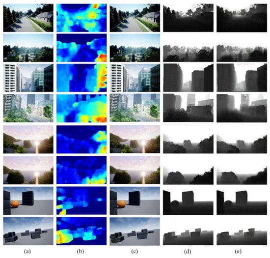 We train our model in the following conditions: the number of epochs is set to 100. The batch size is set to 1, and the lambda of L1 norm is set to 100. In the experiments, we have prepared 16,000 pairs of monocular and depth images for each of the maps. 8000 pairs out of 16,000 are used to training our Pix2Pix-based model. The rest of the pairs in monocular and depth images is employed to test out model. In the labelling process, the depth and monocular images are taken through multiple flights with a variety of routes in AirSim beforehand. Figure 10 shows the examples of the inputs and outputs of the model trained with the parameters. Figure 10a shows the RGB images taken by a monocular camera during flights in the four maps of AirSim. At the same time, we obtain the optical flow maps as shown in Figure 10b. From the images, we derive RGB images with embedding an optical flow map in Figure 10c. Compared to the ground truth images in Figure 10d, our proposed method generates depth images as shown in Figure 10e.