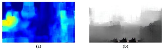 represents the pixel value of the optical flow map at the pixel position of embedded in the monocular image. is the pixel value of the monocular image at the pixel position and is the displacement of frames in the optical flow map at the pixel position. When the is 0, the color of optical flow heat map is deep blue as shown in Figure 8a. We do not use all optical flow pixels to estimate depth since these pixels can be also noises to prevent accurate depth estimation. Therefore we need to select optical flow pixels to use optical flow information efficiently. i is interval between the monocular image the pixel value and optical flow map value. In this way, the optical flow map can be used effectively.