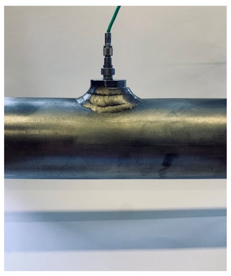 The supersonic velocity of the generated shock waves along the driven section was determined by solving the system of three Equation (2), where the measured times of the shock front passages over four identical side-wall piezoelectric pressure sensors (Kistler, 603CAA) that are flush mounted in the side wall of the driven section and their locations (denoted as x1, x2, x3 and x4 in Figure 1) were considered. A closer view of one of the installed side-wall pressure sensors is shown in Figure 2. The first side-wall pressure sensor was installed 2.25 m downstream of the FOV, where the shock wave reaches the developed conditions for the initial driver gauge pressures of 4 MPa or higher []. The separation distance of the adjacent pressure sensors xi+1 − xi for i = 1 and 2 is 1.5 m, for i = 3 it is 1.5019 m and xwall − x4 = 0.0684 m. The output signals of the side-wall pressure sensors are connected in series to the same input of the charge amplifier (Kistler, 5018A, integrated 2nd order low-pass Butterworth filter with a cut-off frequency of 200 kHz (−3 dB)). The group voltage output signal U(t) is, furthermore, acquired with a digitizer (National Instruments, NI 9775, sampling frequency 20 MHz, integrated 6th order low-pass analog Bessel filter with a cut-off frequency of 13.9 MHz (−3 dB)). The times of the shock wave passages over the centers of the side-wall pressure sensors were determined as the times at which the group voltage output signal gradients reach their local maxima. The local maximum gradients in the signal were determined as local maxima in the voltage output signal transformed by the mean-shift-based (MSB) method, which calculates the differences between the sum of the adjacent short signal segments of the same width that are time-shifted between each other by the width of the segment []: