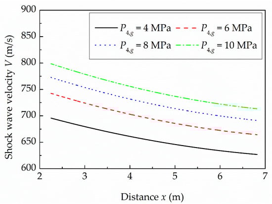 Figure 3 presents the shock wave velocities along the driven section obtained for different initial driver gauge pressures P4,g. From the figure, it is clear that, due to the thermal-viscous effects, the velocity of the generated shock wave at the lowest initial driver gauge pressure of 4 MPa decreases from approximately 696 m/s at the position of the first side-wall pressure down to approximately 627 m/s at the end-wall, while, for the highest initial driver gauge pressure of 10 MPa, the velocity decreases from approximately 799 m/s down to 713 m/s. The average obtained functional dependencies of the velocity along the driven section are V(x) = 1.74x2 − 30.96x + 757.22 for P4,g = 4 MPa, V(x) = 1.97x2 − 34.90x + 811.36 for P4,g = 6 MPa, V(x) = 1.98x2 − 35.68x + 843.34 for P4,g = 8 MPa and V(x) = 1.97x2 − 36.70x + 871.73 for P4,g = 10 MPa. Therefore, the amplitude of the generated pressure step at the end-wall determined using Equation (1) increases from approximately 0.89 MPa to 1.42 MPa when increasing the initial driver gauge pressure from 4 MPa to 10 MPa.