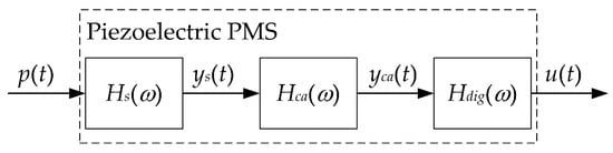 All the components of the piezoelectric PMS are modelled as linear, time-invariant dynamic systems. Therefore,  equals the product of the FRFs of the pressure sensor  the charge amplifier  and the digitizer  see Figure 5. The pressure sensor is modelled as a second-order dynamic system with the FRF [,,]: