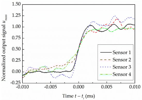 where  is the measured PMS’s group voltage output signal,  is its average value prior to the sensor’s response to the shock wave passage (the averaging window has a length of 10 × 10−3 ms and ends at  prior to the determined passage time of the shock front, where Ds = 5.55 mm is the physical external diameter of the piezoelectric pressure sensor specified by its manufacturer),  and  are the values of the measured and normalized theoretical voltage output signal at the passage time of the shock front determined by applying the MSB method to the output signals, respectively. Figure 6 shows the normalized measured responses for all four identical side-wall pressure sensors at P4,g = 10 MPa. From the figure, it is clear that, due to the fact that the output signals of all four pressure sensors are connected to the charge amplifier in series, the group voltage output signal prior to the response of the second, third and fourth sensors installed downstream of the FOV to the shock wave passage is greatly affected by the phenomenon behind the shock wave that, at that time, excites the upstream pressure sensors. These effects are also seen in larger oscillations of the signal prior to the response of the second, third and fourth sensors to the shock wave passage, which makes it difficult to determine  for these three sensors. Therefore, the second, third and fourth side-wall pressure sensors installed downstream of the FOV, which are identical to the first side-wall pressure sensor, were excluded from further analyses in determining the side-wall pressure sensor’s effective diameter.
