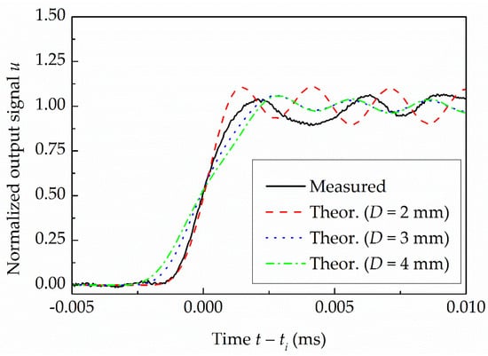 The use of the physical model presented in the previous subsection requires information about the effective diameter of the pressure sensor. This parameter was determined based on the best fit between the normalized measured output signals of the side-wall PMS and the theoretical output signals obtained with the physical model, where, in the physical model, the shock wave velocities determined at the locations of the side-wall sensors Vi were considered. The measured output signal of the side-wall pressure sensor was normalized with respect to the theoretical normalized output signal so that both signals had zero initial values and equal values at the detected passage time of the shock front:
