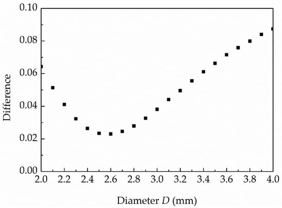 To determine the effective diameter of the pressure sensor more accurately, the differences between the normalized measured responses obtained with the first side-wall pressure sensor from all the repeated measurements for all four initial driver pressures and the theoretical responses for different sensor’s effective diameters were calculated. The absolute values of the differences were determined in the range from 0.15 to 0.85 of the normalized output signals to avoid the effects of any additional oscillations in the measured PMS signal before and after the response of the sensors to the passage of the shock front that are seen in Figure 7. Figure 8 presents the average differences for the diameters from 2 mm to 4 mm with a step of 0.1 mm. The results show that the smallest average difference is obtained for the diameter of 2.6 mm, which determines the effective diameter of the four identical side-wall pressure sensors installed in the developed diaphragmless shock tube.