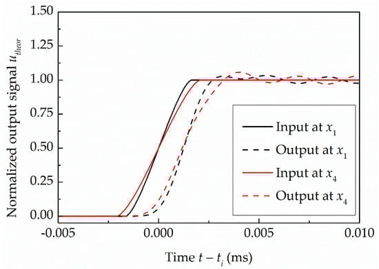 The errors in the detection of the shock front passage times over the side-wall pressure sensors were determined as the differences between the detected times of the shock front passages determined by applying the MSB method to the simulated output signals of the side-wall PMS and the passage times of the shock wave over the centers of the sensors ti determined by the time at which normalized simulated input signals reach the value 0.5. In the physical model, the shock wave velocities determined at the locations of the side-wall sensors and the effective diameter of the pressure sensor of 2.6 mm, as determined in Section 3, were considered. Figure 9 presents the effect of different shock wave velocities at different locations of identical pressure sensors along the driven section of the shock tube on the sensors’ input and output signals. The graph shows the signals for the first sensor at an initial driver gauge pressure of 10 MPa and the fourth sensor at an initial driver gauge pressure of 4 MPa, where the highest and the lowest observed shock wave velocities occur, respectively. It is clear that, by increasing the shock wave velocity, the slopes of the PMS’s input and output signals increase. Due to the fact that the component part of the PMS is also the pressure sensor, which is an underdamped second-order dynamic system, the response of the PMS to a relatively rapid pressure change shows an oscillation at the damped natural frequency of the pressure sensor. From Figure 9, it is also evident that the differences between the shock front passage times over the centers of the sensors and the times of the corresponding normalized output signals reaching a value of 0.5 are similar for both cases. Table 1 shows the errors in the detection of the shock front passage times over the centers of four side-wall pressure sensors εi, where i = 1 to 4. The results for different generated shock wave velocities and different locations of the side-wall pressure sensors show that the time delays due to the response of the side-wall PMS are between 1.271 × 10−3 ms for the fourth sensor at the lowest observed initial driver pressure and 1.285 × 10−3 ms for the first sensor at the highest observed initial driver pressure.