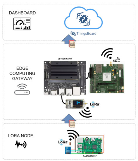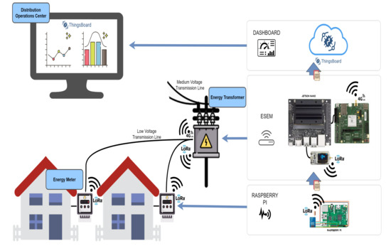 - The laboratory development and implementation of an AMI, making use of embedded modules such as NVIDIA Jetson Nano and Raspberry PI 3, coupled with wireless communication modules for the development of wireless networks, over which messages may be sent and received in real-time, using the concepts of IoT and Edge Computing. The function of each module in the proposed laboratory infrastructure is presented in Section 4. Observe that the objective is not to compare the performance of the electronic components, but to implement an AMI in a laboratory, enabling the simulation of a smart grid with regard to information traffic between the SMs, represented by Raspberry PI 3, and DOCs, represented by the Things Board Platform;