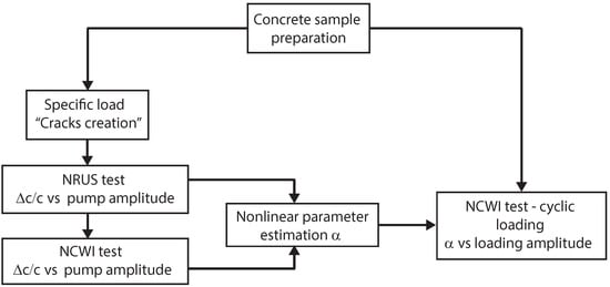 In this section, we describe the concrete sample preparation, then we present a brief description of the CWI technique and its implementation. The physical principles behind the nonlinear elastic behavior in conjunction with the NRUS method are also explained along with the implementation of the NCWI technique. Our experimental plan consists of testing a concrete sample with the NRUS technique and using this as a basis for the implementation of the NCWI technique. After this preliminary study, we perform the NCWI tests at different levels of compression loads (Figure 1).