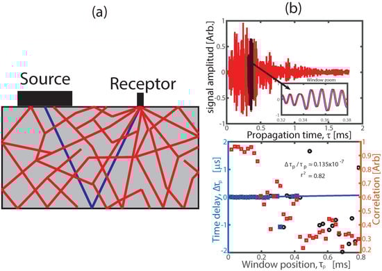 CWI technique. (a) Schematic diagram showing the principle of the CWI technique with a coda wave source and a small receptor. The coherent pulse is shown in blue while the diffuse waves are shown in red. (b) Sound speed estimation by fitting the filtered curve against (blue). In Figure 2b above, two consecutive coda signals are shown and in the inset it is highlighted the time-shift of a specific window (black). In Figure 2b below it is shown the against (blue and black) and (red), which is used as a filter to select the good estimates (blue).
