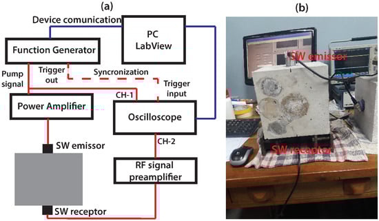 We implemented the NCWI technique to monitor the microcrack proliferation in concrete samples with a similar methodology described in [13], but using an SW ultrasonic probe as a nonlinear modulator (SW pump-wave source). As shown in Figure 4, a coda transmitter sends (ultrasonic transducer of central frequency 250 kHz, Panametrics, model V1012 Videoscan) a pulse of 250 kHz each 2 ms and the multiple scattered waves are captured by a coda receptor (ultrasonic transducer of central frequency 100 kHz, CTS Valpey-Fisher Corporation, model SSOO58). Both transducers were excited and amplified by a Pulser-receiver (Olympus, model 5800) used in mode through-transmission. The transmitted coda signal was first filtered in the Pulser-receiver by a high-pass filter of 100 kHz to avoid the coherent low frequency signals, then amplified by the RF-Signal Preamplifier Stanfor and finally captured by the digital oscilloscope Tektronix.