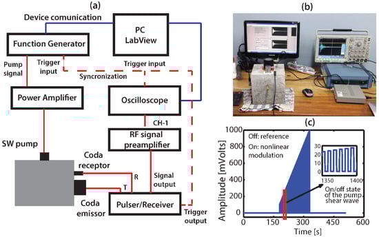 The microcracks nonlinearity are modulated by the SW pump-wave source (same ultrasound probe used in NRUS technique), which by using the function generator WaveTek sends a linear frequency sweep of 10–55 kHz each 30 ms repeated continually during the ramp-time of 16 s. During the test, the amplitude of this frequency sweep increases gradually from 10 mV to 1 V and is amplified by the power amplifier (Figure 4c). This process is performed in an intermittent fashion to compensate for any linear sound speed variations (thermal variations) [8]. The function generator trigger source is used to synchronise the process of coda wave registration through the oscilloscope and both devices are controlled by LabView software.