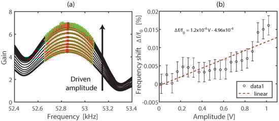NRUS results. (a) Gain spectre for incremental levels of the driven amplitude. The red curve represents the second order polynomial fit around the gain peak (red colour data). (b) Frequency-shift in function of the driven amplitude and estimation of the nonlinear hysteretic parameter . Error bars on (b) were estimated from the fitting coefficients.