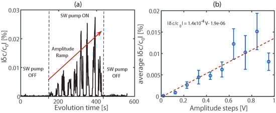 Figure 6 shows the results of the application of the NCWI technique using the experimental setup described in Section 2.4. Here we used the same concrete cubic sample tested before by the NRUS technique (Section 3.1). The relative change of sound speed between two consecutive coda signals is shown in Figure 6a. The peaks observed in the central zone (SW pump is ON) correspond to the incremental variations in the sound speed produced by the SW pump-wave source (amplitude ramp). The average value of the sound speed variation for each amplitude step of the SW pump-wave source is shown in Figure 6b. The linear fit allows us to obtain the nonlinear elastic hysteretic parameter , which is relatively similar to the value estimated previously by the NRUS technique (Figure 5b, Section 3.1).