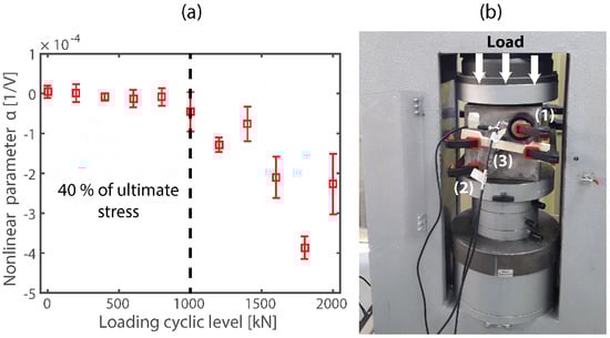 Figure 7a shows the results of the NCWI application to a concrete cubic sample after incremental cyclic loading. For each loading level, we estimate the nonlinear elastic hysteretic parameter from the sound speed variation curve as a function of the pump-wave source amplitude (see Figure 6b). We observe that before reaching a loading level corresponding to (around 1000 kN) of the ultimate stress the nonlinear parameter is almost negligible. However, after this loading level starts to decrease gradually, showing an increment in the nonlinear hysteretic behavior where the negative value is used to show material softening (note that in Figure 6 we use absolute values). We observe an increment in dispersion data with the loading level, which may indicate problems of coupling contact between ultrasound probes induced by the concrete sample cracking (signal lost) and may also show an increment of decorrelation between coda signals. As was previously described in Section 2.4, in Figure 7b we show the experimental setup where the ultrasonic probes in the front face of the cubic sample and the load applied front the top.