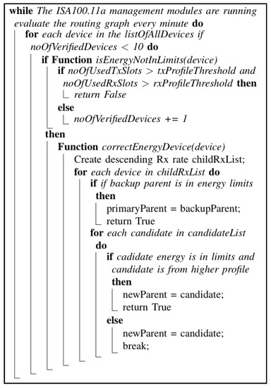 The PEAR algorithm aims to provide energy balancing support without interfering with the control and monitoring performance. The evaluation period was empirically set to one minute, which is considered large enough not to affect the efficiency and performance of the ISA100.11a management modules and small enough to provide more routing change opportunities for the PEAR algorithm. Moreover, given that CDS VR950 Gateway [10] collects new energy information from field devices every 30 s, a one minute evaluation period ensures that for each evaluation cycle the energy information is updated. Within each evaluation cycle, the energy consumption is assessed for a maximum of 10 field devices to limit the processing load.