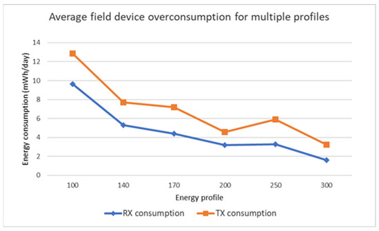 The field devices are configured to provide periodical reports comprising the number of Tx and Rx timeslots used within an implementation-specific update period of 30 s. The reported consumption rate is compared with the corresponding energy profile. The energy consumption is considered within the profile limits if both the DPDU Tx and Rx rate are below the energy threshold.