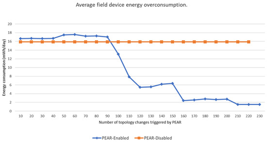 Concluding, if the energy margin (defined as the difference between the energy profile and the average field device consumption) is at least 50 data packets/minute, the PEAR solution can ensure the expected cluster lifetime. Moreover, PEAR extends the cluster lifetime by up to 3.2 times while reducing the average energy consumption by 23.6% and the total overconsumption 10.4 times after triggering 210 network topology changes.