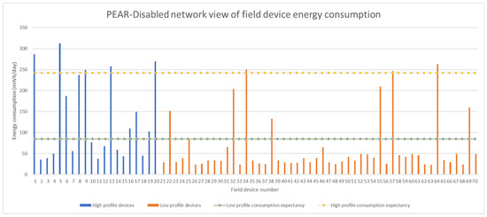 Average field device energy consumption for all devices in the network differentiated by the energy profile when PEAR is disabled.