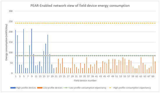 Average field device energy consumption for all devices in the network differentiated by the energy profile when PEAR is enabled.