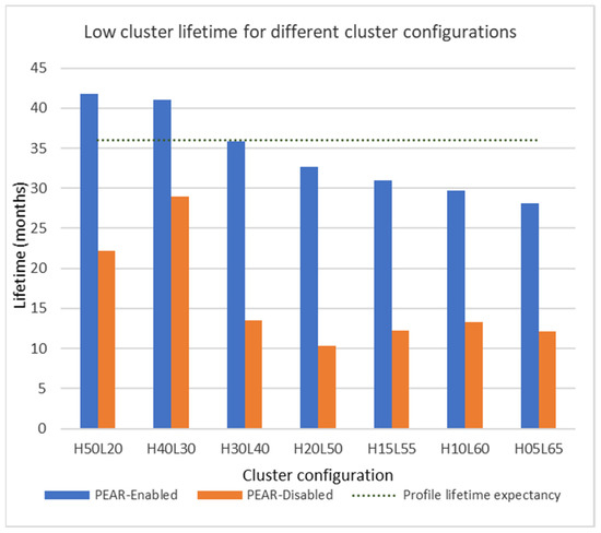 Comparison between PEAR-Enabled and PEAR-Disabled low cluster lifetime for different cluster configurations.