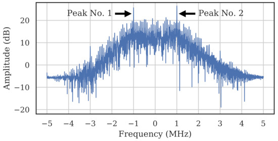FFT of the square of a WirelessHART burst with yielded peaks. Centering the peaks about 0 MHz center-aligns the carrier and corrects the frequency offset.