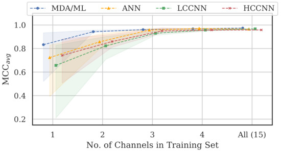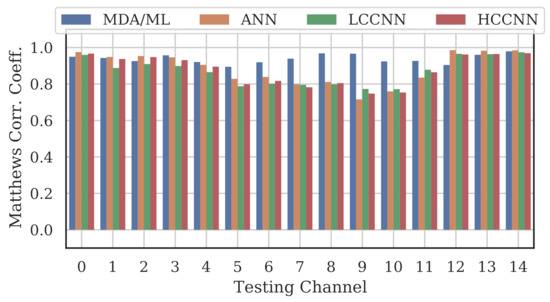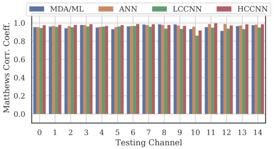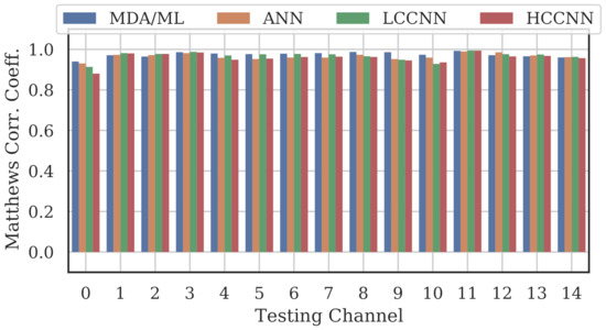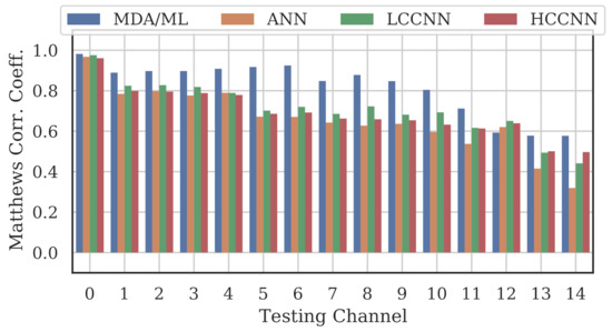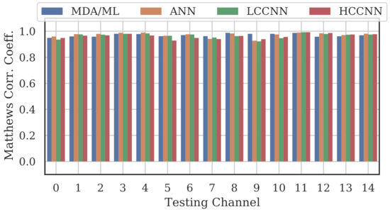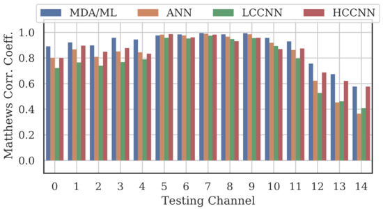 The training and validation datasets described in Section 2.5 were subdivided into 15 subsets, one for each channel, yielding a total of 5 K training observations and 500 validation observations per device in each subset. Then, the four models were trained with each subset to create a total of 60 single-channel RFF models. All models were evaluated on the full evaluation dataset described in Section 2.5, which contained bursts from all 15 channels. MCC was calculated using Equation (6).