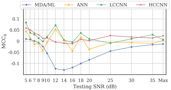Figure 18, which depicts noise performance of the LCCNN models, is representative of the results across all model types. As expected, MCCs for both the single- and multi-channel models worsened as SNR was decreased. To help determine whether multi-channel models gained an advantage against noise, we define a new metric, , as the difference between multi-channel performance and single-channel performance for a given model type, i.e.,