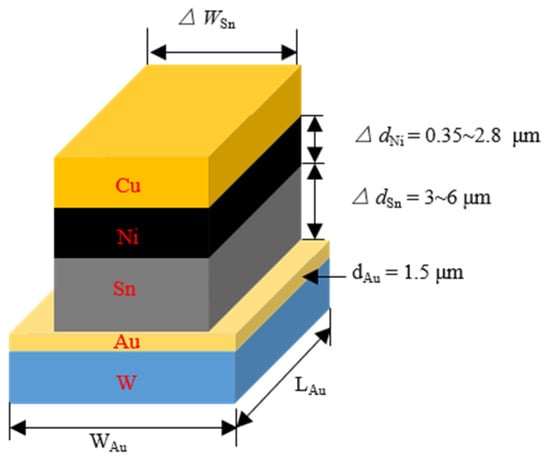 To control the diffusion process, a thin Ni-buffer layer was introduced into the bonding structure. The Ni layer has two main effects. First, it can prevent fast diffusion between the low-temperature Sn and Cu components during storage and the step of heating up during the bonding process. Second, the thin buffer layer dissolves into the Sn at the beginning of the soldering reaction. Then the diffusion between the solder materials and the Cu started, and finally, all solder was converted into intermetallic compounds (IMCs). As for improving reliability, control of Ni layer thickness becomes very important. The thickness of the Ni layer varied from 0.35~2.8 μm, while the Au layer was set at 1.5 μm to simulate the interfacial reactions during solid-state aging. We found that all the layers showed a decreasing trend in the shear strength during the early stage. Meanwhile, for the thinner Ni layer, the shear strength decreased to a lesser extent [30]. Based on the actual packaging process, the actual Sn layer thickness was set to 5 μm.