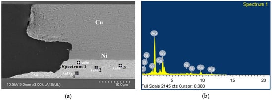 Figure 3 shows the cross-sectional image of Au/Sn/Ni/Cu micro joint with 5 μm Sn layer after the bonding process. It can be seen that Au is consumed and formed IMCs. The Au effective concentration is 44.23 wt.% in the seal ring, and bumps if complete mixing is assumed.