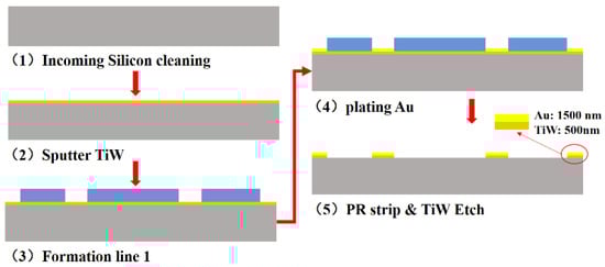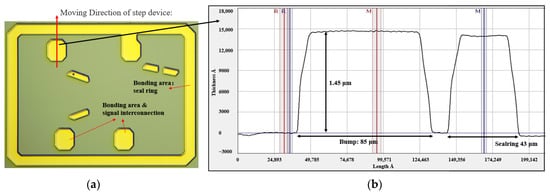 Figure 5 shows the fabricating process flow of the dummy wafer. Ti/W is sputtered on the silicon substrate as adhesive & seed layer. An organic photoresist 6μm thick is spin-coated and patterned. Figure 6a,b show that the pattern of the dummy device wafer and the opening of the seal ring and bump are 43.5 μm and 85 μm, respectively. In Figure 5 (4,5), 1.5 μm Au is electroplated as the bonding layer. Finally, the photoresist is removed, and the seed layer can be etched by the wet process.