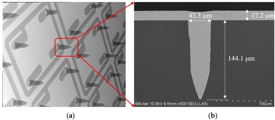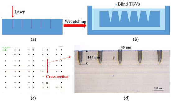 Figure 7c,d shows the cross-section view of the glass capping wafer (SCHOTT BOROFLOAT®33) after the LIDE. In this stage, the glass wafer with a thickness of 600 μm is thinned down to 550 μm. The feasibility of via array with 45 μm in diameter and 145 μm in depth is formed.