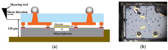 Shear strength test for RF filter WLP. (a) Shear force; (b) Measurement location.