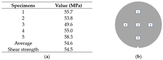 The bonding strength of the Au-Sn joint is measured using die shear testing equipment. The test scheme is made and illustrated in Figure 13a. The bottom silicon substrate is fixed to the holder, and the shearing tool is applied to the glass cap for testing shear strength. The shear direction of the applied force is perpendicular to the glass cap die. The fracture picture after the die shear test is shown in Figure 13b. In Figure 14, the shear strength of Au-Sn bonding is measured with an average of 54.5 MPa. According to the test method standard: MIL-STD-883 (~6 MPa, method No. 2019.5Die shear strength) [29,30,31], this shear force is higher than the standard requirement. Meanwhile, J. Peng et al. [32] suggests that the mechanical reliability of Au-Sn joints during TLP bonding remains stable at 50 MPa at room temperature. In this paper, the shear strength of the TLP-bonded joint is stable, with a value of 54.5 MPa.