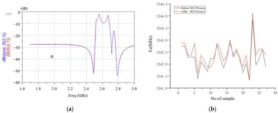 The hermeticity of seal rings for patterned dies was evaluated by exposing them to the wafer and humidity stress test and exposure time was 96 H. The compared results before and after packaging are shown in Figure 15. We found our bonding approach for the electrical performance of the RF filter package provides the structure of the hermetic package. There is no difference in insertion attenuation across the passband (<0.2 dB, standard value: <1 dB) after the WLP process.