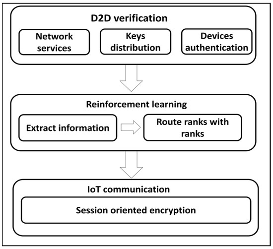 - The third component is secured IoT communication and accomplishing sustainable routing with the support of a D2D session-oriented system. It provides authentic and verifiable sessions between devices, gateways, and sink nodes with low-security costs.