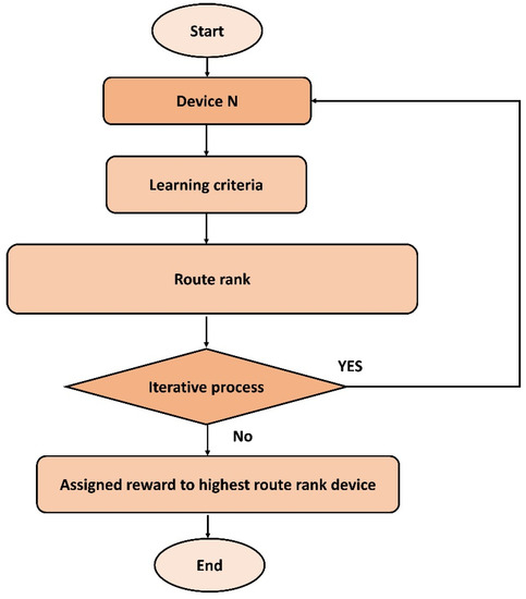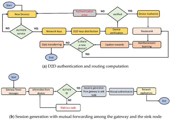Figure 4a,b describes the flowcharts of the proposed algorithm. Initially, the network services and mobile devices gather the network data from the smart environment. Network keys are generated for D2D authentications, and after their verification, they can be a part of the routing. The proposed algorithm determines the value of route rank based on the multi-criteria and updates the nodes’ tables. Afterward, it utilizes reinforcement learning to assign rewards for the nodes. These rewards significantly improve the training process for the devices to extract the optimal neighbors from the set of choices, and accordingly, offer energy-efficient, least error rate delivery paths. Moreover, the proposed algorithm also secures the sessions among the gateway and the sink node for data transfer. Both the gateway and the sink node established secure sessions for their direct communication and are valid for a fixed time interval. After the mutual authentication, the gateways interact with the sink node for forwarding the network data with nominal communication costs.