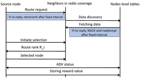 The proposed algorithm utilizes reinforcement learning [33] for computing and selecting the routing states using network conditions and experiences. The reinforcement algorithm is comprised of agents, states, S, and a set of actions, A, per state. Using reinforcement learning, nodeexploits the values and selects the next hop using energy, speed, radio coverage, and link cost metrics. On receiving the data, the next-hop performs the re-computation of the value and forwards the data through its selected routing states. This process is continued for each neighbor selection until network data are received at the sink node. Additionally, when device needs to route the data at the time , it performs a set of actions and selects the neighbor node based on the computed route rank. The value of route rank is dynamically changed by evaluating the network and nodes’ statistics. Later, the devicegains a reward, and enters the next state, i.e., . A node has only a single reward value at any time. If any node has no reward value at any moment, then it will not be allowed to participate in the routing phase. On entering into the next state, the device updates its forwarding table by adding the value of the reward. Moreover, the preceding device retrieves the updated information of device. This practice of reinforcement learning is exploited by the proposed algorithm for finding the most optimal routes for forwarding the IoT data towards the sink node. At the end of the learning period, the entries of forwarding tables are converged to a numeric value that indicates the optimal route from the source device to the sink node. Converged forwarding tables with computation of route rank not only decreases the unnecessary data diverting but also increases the packets reception ratio over the communication channels in the existence of malicious nodes. Figure 2 illustrates the flow of reinforcement learning by exploiting the computed route rank. It uses the multi-criteria of the nodes to determine its rank value and accordingly assign the reward. Based on the updated forwarding tables and reward values the proposed algorithm offers convergence results and increases the route lifetime in terms of energy, speed, and link cost. The convergence levels depend on the number of iterations until end-to-end routes are established with the efficient distribution of constraint resources. Figure 3 shows the message flow for the selection of the next-hop between the source node and its neighbors. The source node floods the route request packet in its radio coverage and identifies the nearest neighbors. In a case when no reply has been received, then it resends the request packet. Once it has found the list of neighbors, then the process of data discovery is initiated, utilizing the node-level table to fetch the statistics. Based on the fetched data, the proposed algorithm computes the route rank using a multi-criteria process and the assigned reward value by exploiting reinforcement learning. Thus, selected nodes advertise their status for the connection in the routing phase, and sensors’ data is forwarded to the sink node.