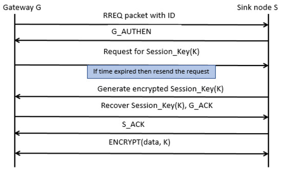 Figure 5 shows the flow of messages between the gateway and sink node for the establishment of a secure session with encrypted data transfer. In the beginning, the gateway device transmits the route request packet along with its id towards the sink node. Upon successful verification, the sink node acknowledges it, and later the gateway device requests the session key. If the time expires, the gateway device resends the request for the session key. Once the sink node receives the request for the session key, it generates the key and sends it towards the gateway device in encrypted form. The gateway device decrypts it and sends an acknowledgment message to the sink node that it has received the session key. The sink node confirms the acknowledgment message and afterward, both devices use the same session key for data encryption and decryption.
