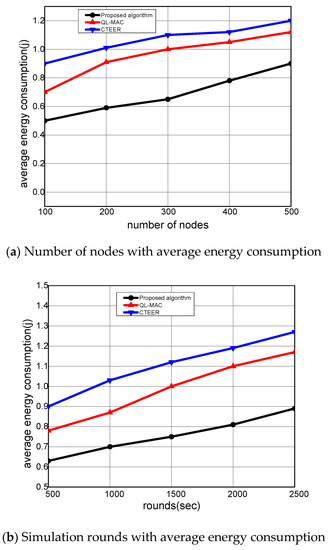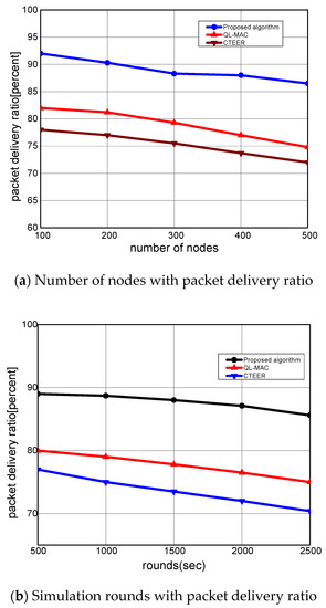 In Figure 6a,b, the performance evaluation of the proposed algorithm is evaluated with other solutions for the packet delivery ratio. It can be computed as the ratio of the number of delivered packets to the total number of transmitted packets from the source node to the destination node. It is seen that with a varying number of nodes and rounds, the proposed algorithm increases the packet delivery ratio by an average of 18% and 17%. This is because the proposed algorithm utilizes the route rank function to estimate the aggregate condition of the devices. Unlike QL-MAC and CTEER solutions, the proposed algorithm periodically judges the situation of the mobile devices in terms of speed, coverage ratio, and packets information, and supports robust IoT-based routing development. Accordingly, it offers the most reliable neighbors for the selection of routing states. Moreover, the proposed algorithm utilizes the position of mobile sensors to balance the load among devices, thus ultimately increasing the delivery performance towards the sink node. Additionally, the sensing range is exploited by the route rank function to incorporate the high node density option in routing decisions. The proposed algorithm makes use of multi-hop mode for forwarding the network data rather than single-hop mode, and gateways perform the intermediate roles among mobile sensors and the sink node. Such an approach efficiently exploits the coverage option and robust connectivity among deployed devices and network applications.